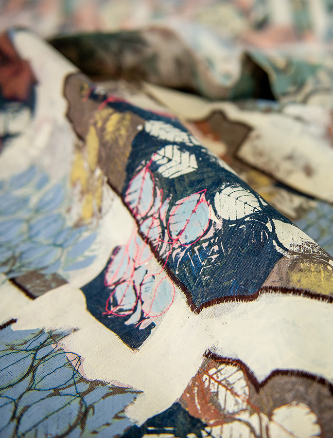 My work is a combination of silkscreened contemporary designs and vintage botanical images embellished with cotton / metallic thread and oil pastel. The color palettes are driven by interior design trends so I am fortunate to have an ever changing source of inspiration.